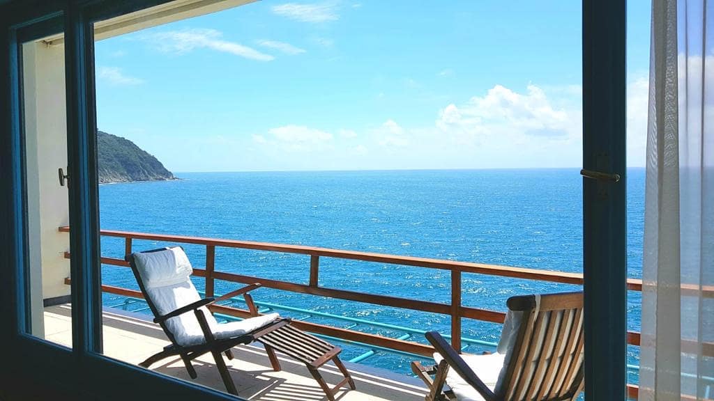 Vista mare – 120 mq. situata al primo piano, speculare all’executive suite, è composta da una camera matrimoniale fronte mare, due bagni – di cui uno con vasca – cabina armadio, due camere con letti singoli per un totale di 6 posti letto e un’ampia terrazza privata che segue il perimetro della suite lato mare.